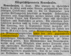 Am 1. Mai 1925 wurde vom damaligen Hauptmann Mathias Schenkel der Gedanke aufgegriffen, in Neuenhausen ein eigenes Tambourcorps zu gründen. Dies wurde begeistert aufgenommen und schon im Juni 1925 fanden sich in der damaligen Gastwirtschaft von Max Hagen („Alte Post“) musikbegeisterte junge Leute zusammen, die aktiv in diesem Corps mitwirken wollten